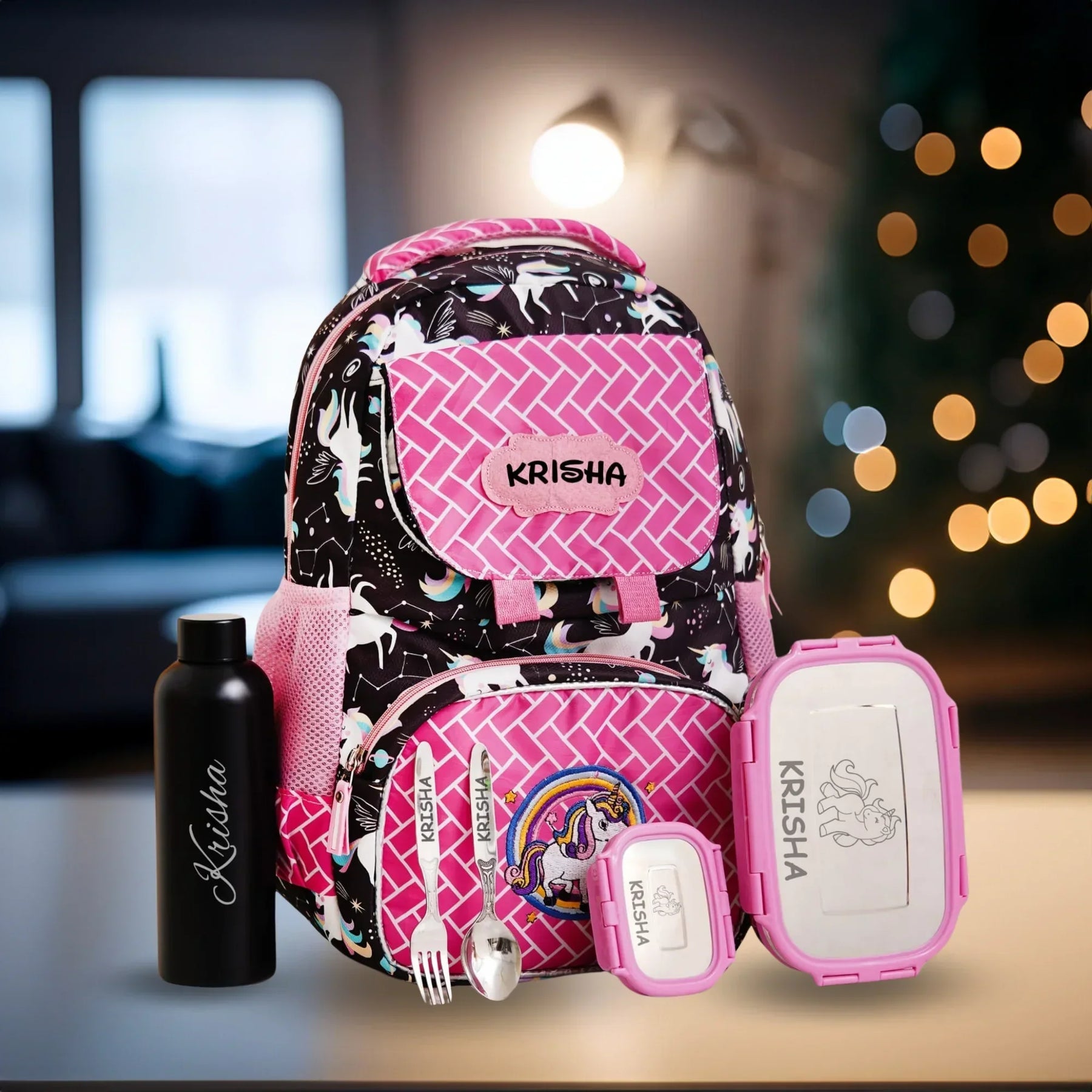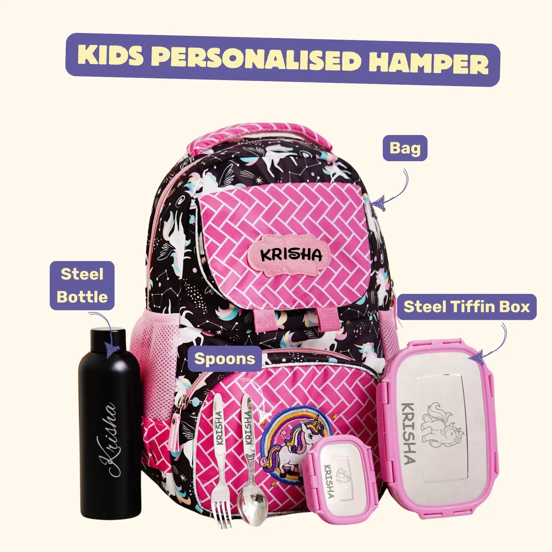 Your Gift Studio Pony Print Kids Backpack, Tiffin, Fork, Spoon & Bottle Customised Hamper